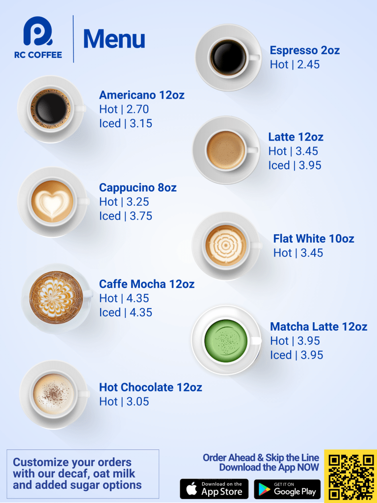 Created eye-catching posters for RC Coffee locations to help strengthen brand visibility, attract customers and drive sales.